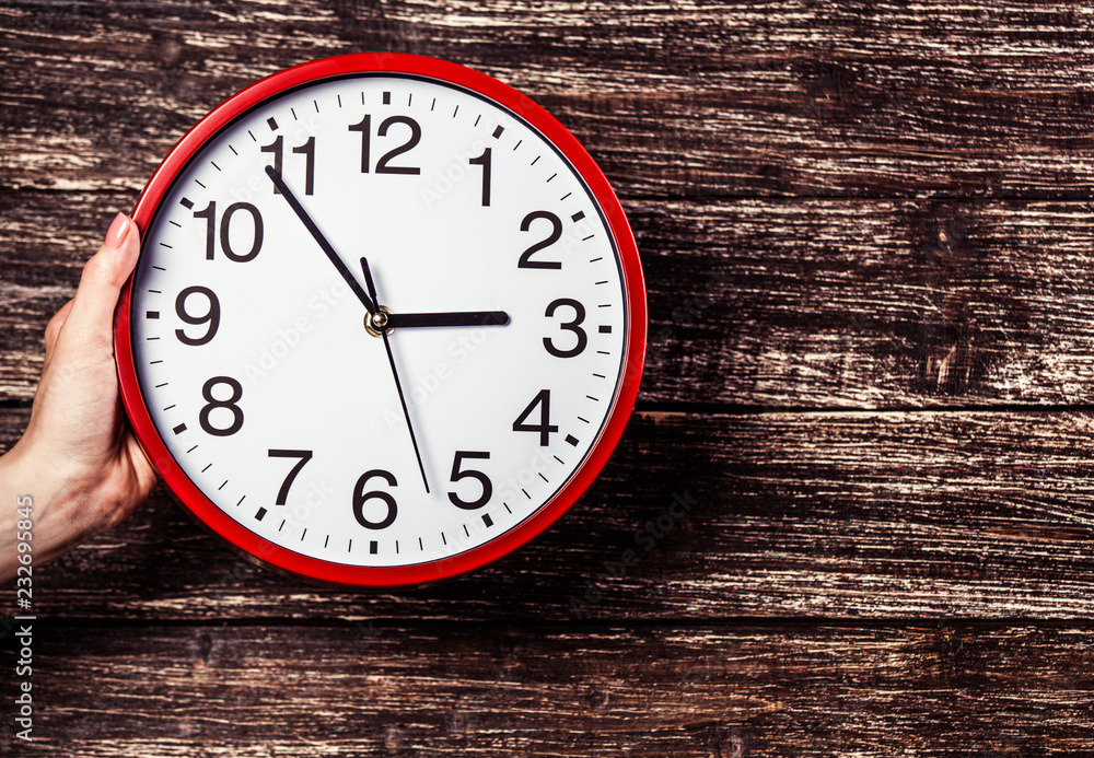 Hand Holding Big Clock On Wooden Table Above View Stock Photo Adobe Stock
